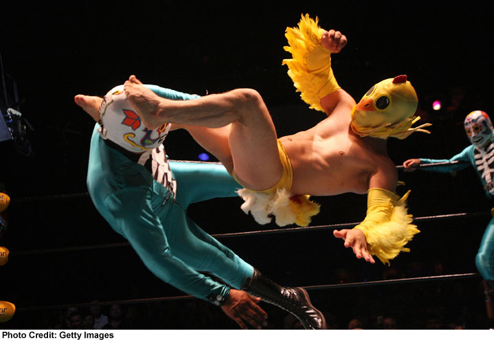 LOS ANGELES, CA – MAY 05: Lil Chicken and one of Los Cavaleras luchadores, traditional Mexican wrestlers, perform at the Lucha Vavoom Cinco de Mayan! show at the Mayan Theater on Cinco de Mayo, May 5, 2009 in Los Angeles, California. Lucha Vavoom combines elements of theatrical Mexican masked wrestling shows known as Lucha Libre with American burlesque. Cinco de Mayo, or May Fifth in Spanish, celebrates the unlikely victory of 5,000 ill-equipped Mestizo and Zapotec Indians led by General Ignacio Zaragoza over the the much better-equipped French forces at the Battle of Puebla on May 5, 1862 in Puebla, Mexico. In the US, Cinco de Mayo is often mistakenly equated with Mexican Independence which was on September 16, 1810. (Photo by David McNew/Getty Images)