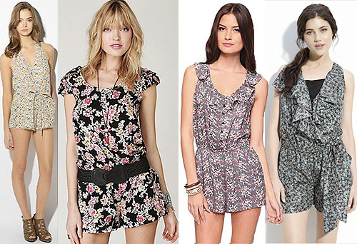 From left to right: Urban Outfitters Printed Deep-V Romper, Lucca Bow Back Printed Romper, Forever 21 Ruffled Floral Romper, and Hinge Silk Romper.