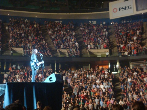 Looking through the packed crowd at the Izod Center on Monday night, Dave Grohl points to two young teens and says, “You guys want to know how to start a rock and roll band? You don’t need a computer, you need one of these,” as he points to his guitar. The crowd went wild. “Next time you go see your favorite band in concert, make sure they don’t have a fucking computer, and they’re just a bunch of guys on stage!”