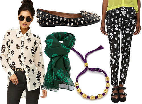 Pictured above: Skull Chiffon Blouse from NastyGal, Jeffrey Campbell Skulltini Flats, Alexander McQueen Skull Print Scarf, Shashi Skull Couleurs Bracelet, and Tripp NYC Skulls Jean.