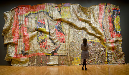 El Anatsui (Ghanaian, b. 1944). Earth’s Skin, 2007. Aluminum and copper wire, 177 x 394 in. (449.6 x 1000.8 cm). Courtesy of the artist and Jack Shainman Gallery, New York. Photo by Joe Levack, Courtesy of the Akron Art Museum