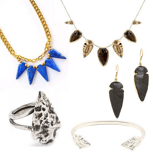Pictured above: K Amato Arrowhead Necklace, House of Harlow 1960 Multi Arrowhead Necklace, Pamela Love Mini Arrowhead Ring, Fashionology Arrowhead Bangle in Silver, and Charles Albert Obsidian Arrowhead Earrings.
