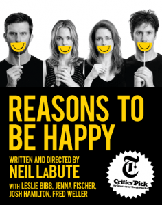 It’s another Neil LaBute, ‘kick it out of the park’ 4-person smart situational 2 act that’s playing down at The Lucille Lortel in the West Village. Treated to Leslie Bibb, Josh Hamilton, Fred Weller and the just ended The Office’s Jenna Fischer in Reason’s To Be Happy, I couldn’t have walked away any happier myself.