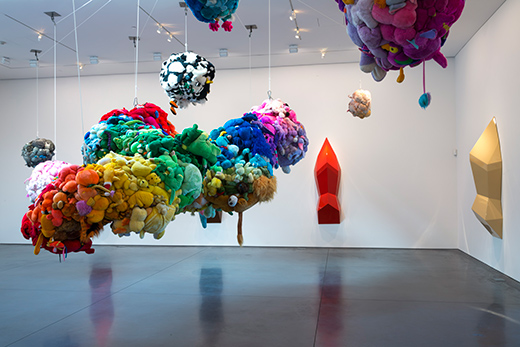 Mike Kelley. Deodorized Central Mass with Satellites. 1991/1999. Plush toys sewn over wood and wire frames with styrofoam packing material, nylon rope, pulleys, steel hardware and hanging plates, fiberglass, car paint, and disinfectant. Overall dimensions variable. (c) Estate of Mike Kelley. Images courtesy of Perry Rubenstein Gallery, Los Angeles. Photography: Joshua White/JWPictures.com.